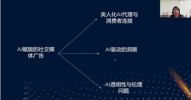讲座伊始,封老师以AI赋能的社交媒体广告的定义为切入点,指出AI技术在社交媒体广告中的主要使用方式:AI不仅作为人工智能代理(AI agents),如虚拟网红和谈话机器人,与消费者进行沟通;还作为一种数据分析工具,通过挖掘消费者分享在社媒平台上的数据,洞察消费者想法,以创造更具关联性和互动性的广告内容。