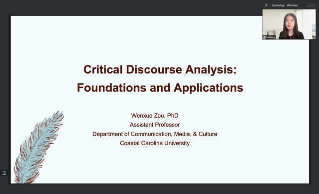12月9日上午,美国卡罗莱纳海岸大学传播、媒体和文化系助理教授、硕士生导师邹文雪老师受邀为上外新闻传播学院的同学们带来题为《批评话语分析:基础与应用》的讲座,结合案例详细讲述了批评话语分析(CDA)研究方法的概念与实际运用。陈沛芹教授主持讲座。