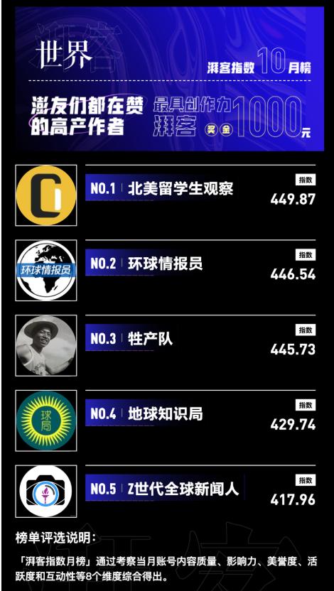 本次我院“Z世代全球新闻人”账号成功入围“湃客指数月榜”,该榜单旨在表彰并激励湃客平台上每月展现出卓越创作力的优质原创作者。该榜单通过考察账号内容质量、影响力、美誉度、活跃度和互动性等8个维度,综合得出湃客指数,并按照品类进行排名,每个品类各评出5名优质创作者,共计80名。 上海外国语大学新闻传播学院一直聚焦全球化、实践型、厚基础特色开展国际新闻传播人才培养,打造了一系列具有影响力的品牌实践项目,夯实了学生的实战能力。后续学院还将继续建设“Z世代全球新闻人”账号,持续发布其他优质实践作品。