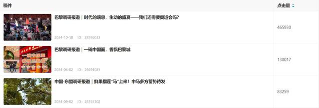 其中,2024年法国巴黎奥运会系列报道《时代的喘息,生动的盛夏——我们还需要奥运会吗?》当前点击量超46万,2023年巴黎调研报道《巴黎调研报道|一碗中国面,香飘巴黎城》点击量超13万,2024年广西国情实践报道《中国-东盟调研报道|鲜果榴莲“马上来!中马多方蓄势待发》点击量超8万。