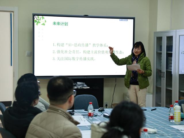 张军芳老师围绕《网络传播》课程,分享了团队在课程建设中的探索与成果。团队以马克思主义新闻观为引领,结合案例教学、互动教学和数字化手段,积极开展课外阅读分析与讨论。团队不仅发表了多篇科研论文,获得教学成果奖,还成功指导多篇优秀学生论文。未来,团队计划进一步探索“AI+思政传播”的新模式,以推动思政教育创新。