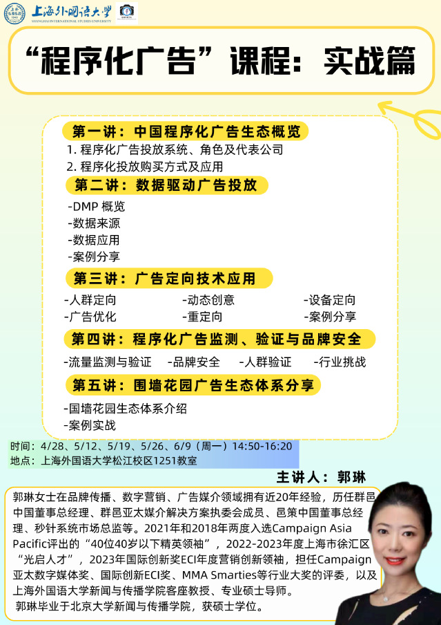 郭琳女士在品牌传播、数字营销、广告媒介领域拥有近20年经验,历任群邑中国董事总经理、群邑亚太媒介解决方案执委会成员、邑策中国董事总经理、秒针系统市场总监等。2021年和2018年两度入选Campaign Asia Pacific评出的“40位40岁以下精英领袖”,2022-2023年度上海市徐汇区“光启人才”,2023年国际创新奖ECI年度营销创新领袖,担任Campaign亚太数字媒体奖、国际创新ECI奖、MMA Smarties等行业大奖的评委,以及上海外国语大学新闻与传播学院客座教授、专业硕士导师。