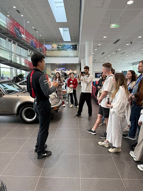 上午九时,全体成员乘坐包车抵达上海保时捷体验中心,开启首站旅程。在专业导览员的带领下,深入了解保时捷品牌历史与技术创新。随后,外国青年们亲身体验试乘项目,在引擎轰鸣中感受精密工艺与速度激情。中午,团队还在保时捷员工餐厅用餐,近距离感受了国际企业的人文氛围。