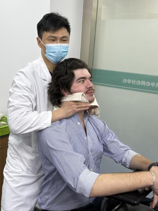 而后青年们来到社区卫生服务中心体验中医问诊。青年们分成三组轮流感受了“把脉”、“拔罐”、“针灸”。在把脉环节,大家轮番体验望闻问切,英国小伙Max的幽默自嘲我还有三个月吗?,在医生少熬夜多食蔬的叮嘱中化作郑重承诺。针灸体验区成为最热打卡点,大家都很积极地报名尝试,感叹中医的神奇!