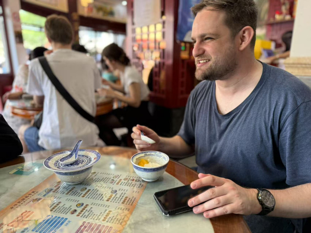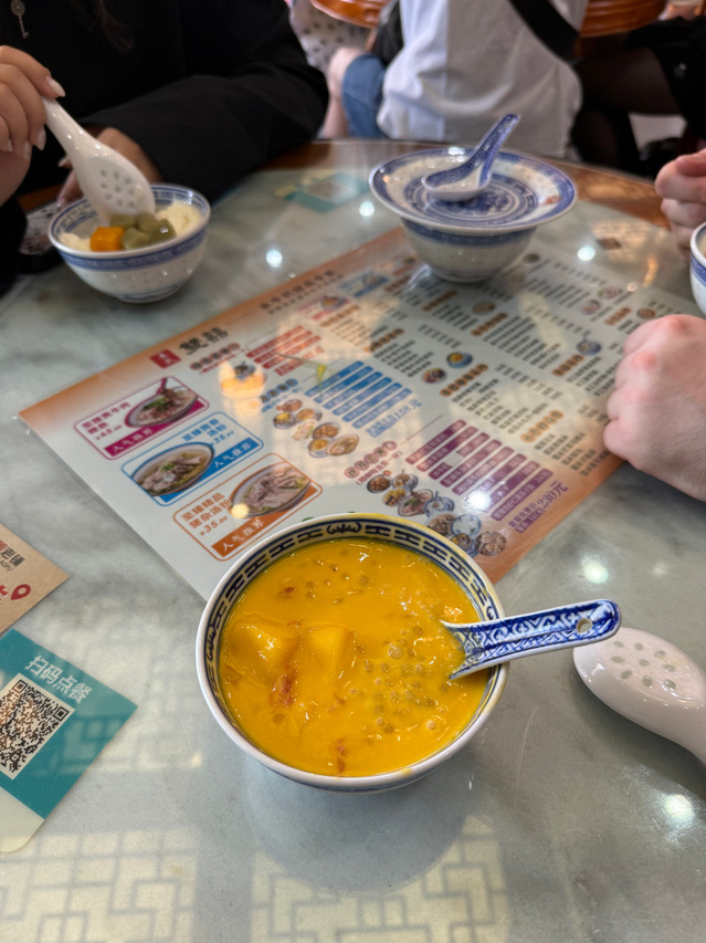 午餐时间,志愿者带大家来到一家粤菜馆“双喜老铺”。奶制品爱好者Eliot迫不及待地点了双皮奶和姜撞奶,上菜后更是赞不绝口:“我去过很多国家,但从没见过这种做法,太神奇了!”尤其是现冲的姜撞奶,需要等待三分钟才能凝固,他笑着说:“这简直太有仪式感了!” Maria看到肠粉后兴奋地推荐给大家,Irene尝过后连连称赞:“太美味了!这次粤菜体验非常成功!”餐桌上欢声笑语,大家一边品尝美食,一边分享这几天的见闻,氛围温馨而愉快。