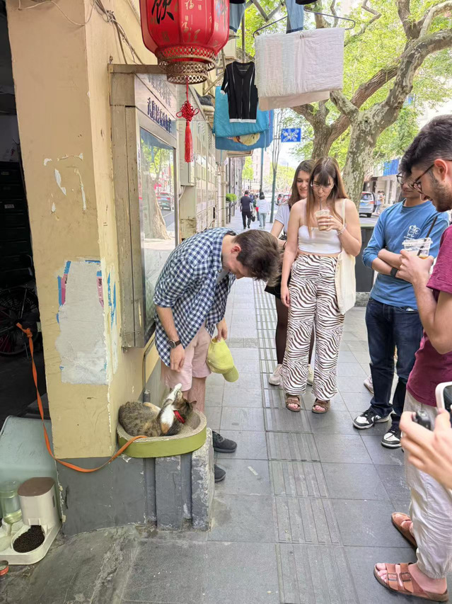 随后,大家沿着武康路漫步,途经充满文艺气息的小店和咖啡馆。不少青年提前做了攻略,主动提出想去网红咖啡店打卡,还体验了一些潮流品牌店,感受上海充满活力的时尚生活方式。一路上, 各式各样的精致小店吸引了大家的注意,尤其是那些“宠物友好”店铺里的可爱动物们。一只打扮时髦的小狗成功让整个团队停下脚步,纷纷掏出手机拍照;而另一只高冷的猫咪则对所有人的逗弄无动于衷,甚至挥舞爪子表示“拒绝营业”,逗得大家哈哈大笑。