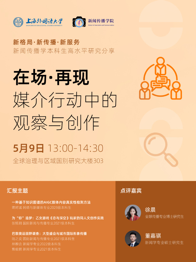 在媒介技术不断演进的今天,观察、创作与内容真实性的把握,早已成为媒介行动中不可或缺的重要环节。如何在变化中捕捉真实?又如何在再现中生成新的意义?本场学术角将以“在场·再现:媒介行动中的观察与创作”为主题,邀请本科生同学们结合亲身参与的田野考察与学术研究,一同探讨媒介实践中的观察、创作与思考。