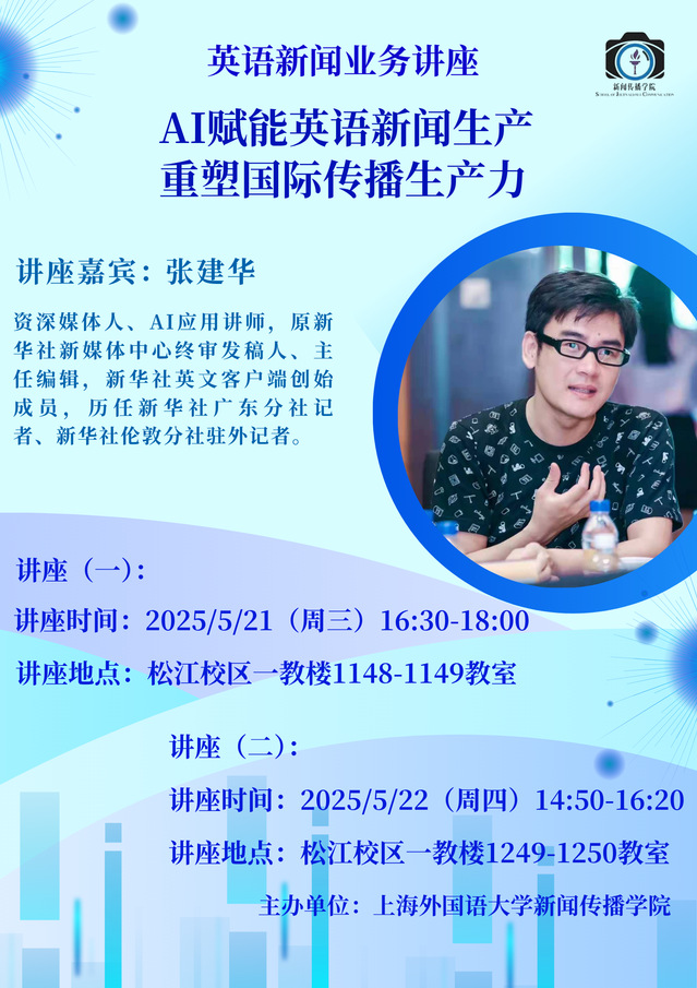 讲座时间:2025/5/22(周四)14:50-16:20讲座地点:松江校区一教楼1249-1250教室主办单位:上海外国语大学新闻传播学院