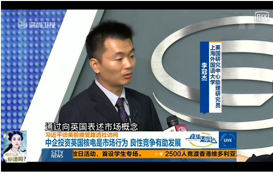 2015年10月18日,我中心李冠杰博士接受深圳卫视直播港澳台节目采访,解读了习近平主席访英前接受路透社访问的用意。李冠杰认为,中英合作的战略眼光旨在表明双方合作既关注当下,更要关注长远。中国向英国表述自由市场概念,符合英国人的思维习惯和相关利益。
