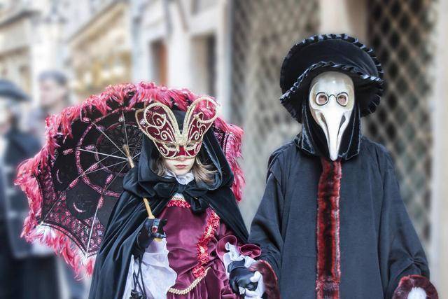 然而,这些瘟疫医生在疫情肆虐期间照顾病人的同时,不免给当时的人们留下心理阴影。弥漫着死亡气息的社会环境、模样恐怖鸟嘴面具、死神般的黑衣装束,这些因素组合在一起,将这些戴着面具的瘟疫医生与疾病、死亡、恐惧等负面标签紧密相连,让人更加忧心忡忡。鸟嘴面具也就成为了瘟疫的代名词。在伦敦大瘟疫的肆虐下,英国民众对于鸟嘴面具的心理恐惧深不可测。由此反观当下英国人民为何不愿意戴口罩的问题,不可否认,受到这一历史传统的影响,人们对于戴口罩的人和口罩本身仍然心存一定畏惧感。口罩之于常人,正如瘟医的鸟嘴面具之于当时惶恐无助的群众,是疾病和死亡的象征。而对于欧洲民众来说,口罩又源于鸟嘴面具发展而来,也被打上了不洁、威胁、感染等记号。因此,每当谈到口罩时,深藏于英国民众内心的瘟疫文化记忆,使其无法完全摆脱负面心理暗示的影响,从而对戴口罩持有抵触的态度。同受瘟疫肆虐的还有当时的意大利,瘟疫医生的形象也在意大利民众留下了难以磨灭的影响。不过,意大利戴口罩的人数比例却远大于英国,除去政策因素,这很可能也和意大利面具文化有关。瘟疫结束之后,瘟疫的鸟嘴面具被审美化,制成了精美的面具艺术品,成为了舞会、展览上的常客。这对于民众缓和潜在的“口罩恐惧”有着不可替代的作用。相对而言,英国并没有这样的传统,对于口罩的恐惧一直未能完全消除。