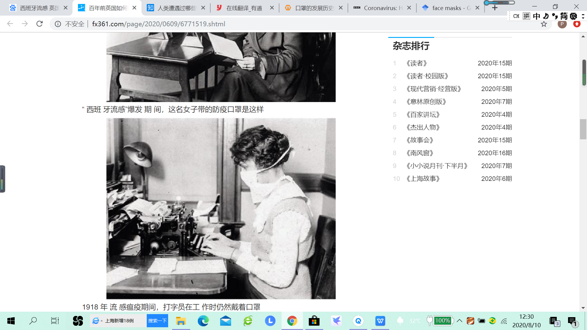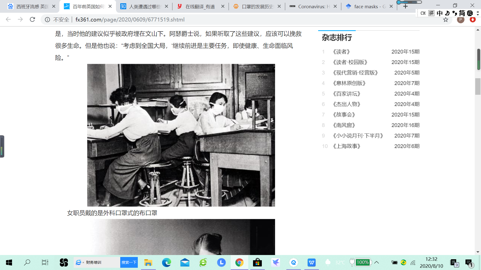 1918年“西班牙流感”大流行,让英国又一次陷入疫情的漩涡。当时英国人民主要通过戴纱布口罩来防止传染。职员在工作场所带上了口罩,清洁工也戴着口罩每天给公交车消毒。但这并不意味着大部分英国民众都具有明确的戴口罩意识。当时的各类公共卫生措施主要由英国地方政府委员会发布,包括染病时自我隔离、尽量避免去往人流拥挤之地、用沾有高锰酸钾的覆盖物遮住口鼻等等。不过,当时很多指令下达时间较晚;且受到当时战争影响,国家对于生产力的需求意味着人们不得不在一定程度上牺牲自己的健康。民众在被警告疫情风险的同时,也在被催促着继续进行工作,并不可避免地聚集在人流密集之地。5此外,政府也下达指令称,纱布口罩只推荐医务人员使用。6在此情况下,民众对于口罩防疫的认识仍然十分模糊。很多人认为,除了与病患密切接触的医护人员以外,其他人无需带口罩,只有部分人(尤其是职工)具有较为明确的防范意识。