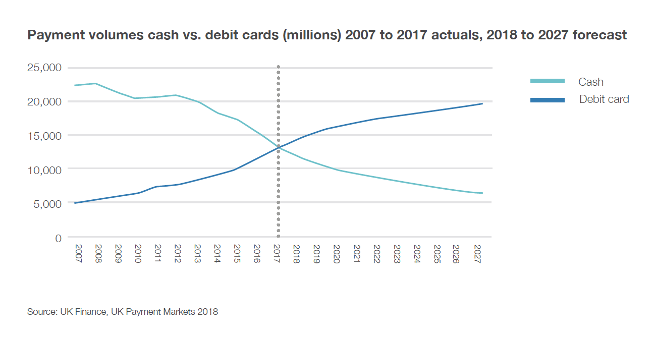 (图片说明:2007年至2017年英国现金和借记卡总支付额的实际走势和2018年至2027年的预测走势,该图表明现金在交易中所占比例逐渐下降。来源:英国2019年《现金使用评估报告》)