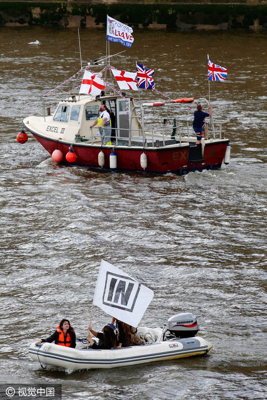 ▲脱欧派和留欧派各自驾船在泰晤士河上示威