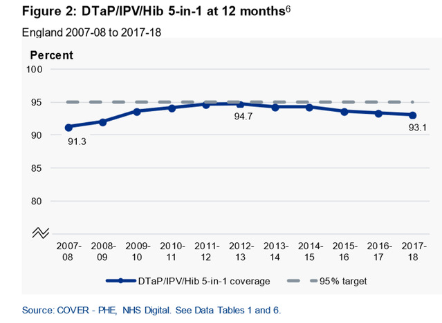 英国在整个欧洲的疫苗接种普及率相对较高,但在近几年仍有下降趋势,例如麻疹疫苗接种率达到了四年以来的最低值,且低于世界卫生组织建议的群体免疫要求达到的比例(95%)。在一些大城市的部分地区比如伦敦北部的卡姆登,有近三分之一的五岁儿童仍未接种麻疹疫苗。根据英国皇家公共卫生协会(RSPH)发布的一份旨在推动疫苗接种的报告,尽管英国民众对健康专家、医务工作者的信任程度较高,相比美国极端自由主义的势头较小,对疫苗副作用和效用的担忧仍是个人包括家长选择不接种或不给孩子接种疫苗的主要原因,对疫苗的群体保护功能的理解也较弱,也因此存在对“疫苗过量”的怀疑(有28%的英国民众认为现代人接种的疫苗过多)。除了报告中提到的预约困难等因素,同样,社交媒体也被认为助长了网络上关于疫苗的反智内容的传播,甚至有推广疫苗的医生受到网络威胁。NHS英格兰首席执行官SimonStevens就直接将反疫苗与麻疹疫苗接种率下降导致麻疹病例增加联系在一起。尽管大部分的英国父母对疫苗对于个人健康和社会公共卫生的作用都有正面的认识,频繁接触网络上关于疫苗的负面信息仍然会造成积聚性的影响,甚至最终扭转部分人的看法。在调查中,五分之二的英国父母都表示在网络上“常常或有时”能接触到疫苗负面信息,而家有五岁以下儿童的父母中几乎有一半都接触过此类信息,且多半是在社交媒体以及网络论坛上。