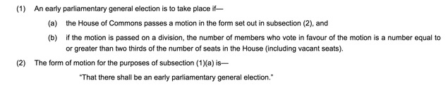 首先,当前议会必须在投票日前25个工作日解散。以上条款固定了议会解散与大选之间的时常,使得首相丧失了制定大选日期的权力。此前,在任首相自行制定大选日期,可以延长其选战时长,例如1997年英国大选,时任首相约翰·梅杰在3月17日解散议会,却直到5月1日才进行投票。在当前政局下,这条法律在使得鲍里斯·约翰逊不可能在10月31日脱欧日之前进行议会大选。在休闭前,议会并未通过政府大选的要求,而议会休闭结束后进行大选,大选日也已经远超10月31日。约翰逊在10月31日实现脱欧可选择的手段,进一步减少。