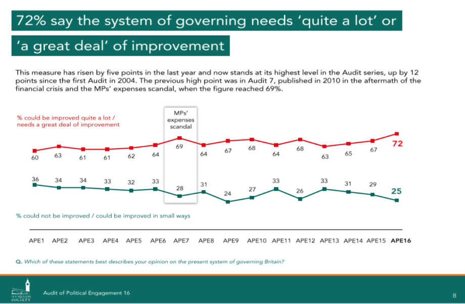 另外,Hansard Society最近进行的一项调查表明,超过一半(54%)的英国人认为“英国需要一个敢于违反权威的强大领导者”,只有23%的人不同意这种看法(图1);英国大部分地区似乎已做好准备进行较为激进的政治改革,因为近3/4人认为英国的政治治理模式需要“相当多”或“大量”改善(图2)。梅上台处理脱欧事宜许久,但英国仍旧深陷脱欧僵局,多数英国普通民众似乎认为只有强大的领袖才能需要“拯救”英国于脱欧水深火热之中。所以,根据民众意向,约翰逊的强人形象还是有根可循的。