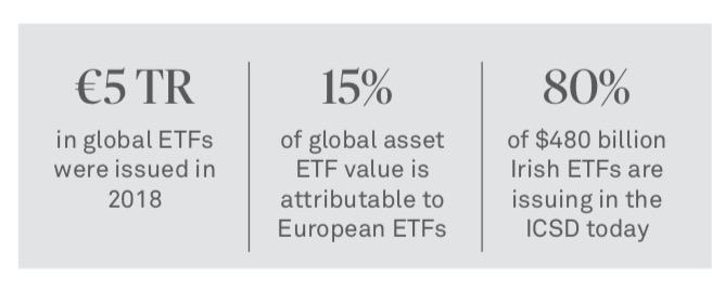 欧洲清算银行一直在与市场和有关当局就资金转移的规模及其带来的挑战进行激烈讨论: UCITS计划ETF必须申请一项安排方案,才能转移到另一家发行机构CSD。据欧洲清算银行的数据显示,虽然4,800亿美元的爱尔兰ETF市场已有80%是使用ICSD模型发行的,但仍有1,000多亿美元的ETF可能会转移。