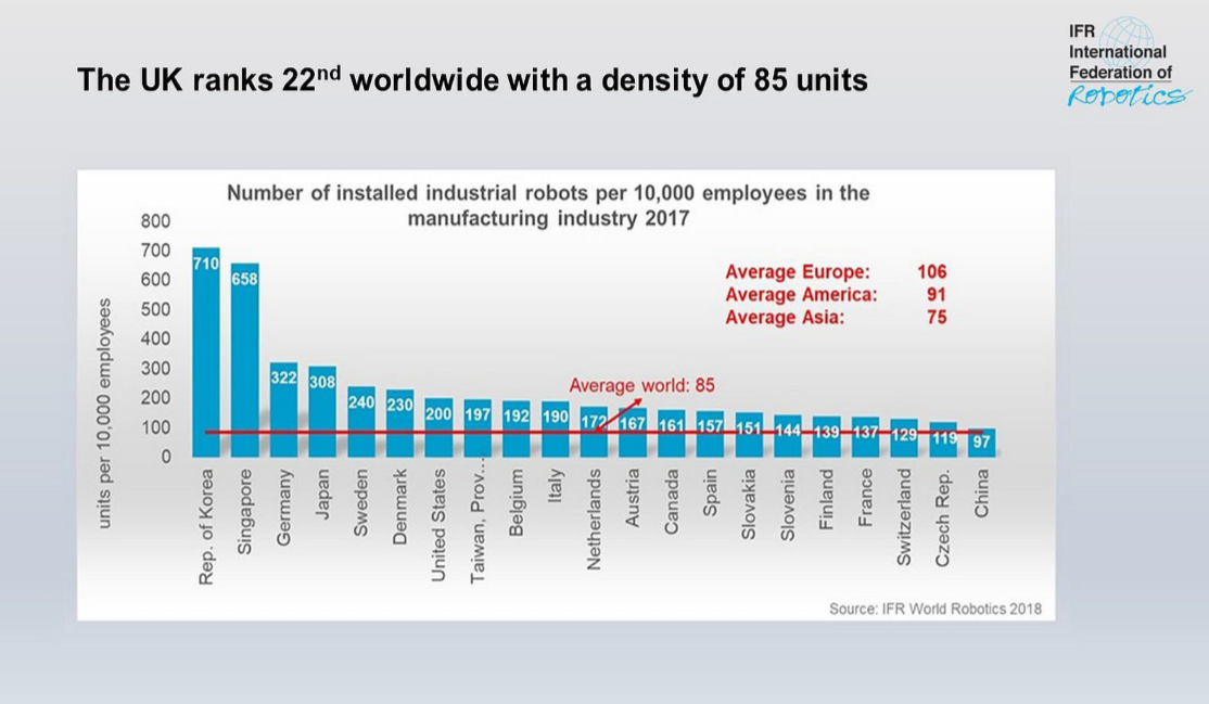(英国的每万人自动化工业机器人数量在全球只排名22,刚刚达到世界平均水平,远低于排在首位的一些国家。数据来源:Brexit: UK falling back in global automation race–robot sales down 3%, International Federation of Robotics Press Release, May 2019)
