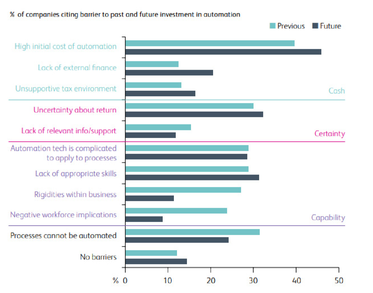 (调查中企业对于过去和未来应用自动化技术面临的问题的投票,资料来源:EEF and Santander, EEF Investment Monitor 2017/18, 2018, p 16)