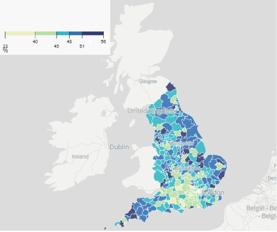 (英格兰不同地区未来的工作岗位自动化程度,颜色越深的地区越面临着自动化带来的冲击)