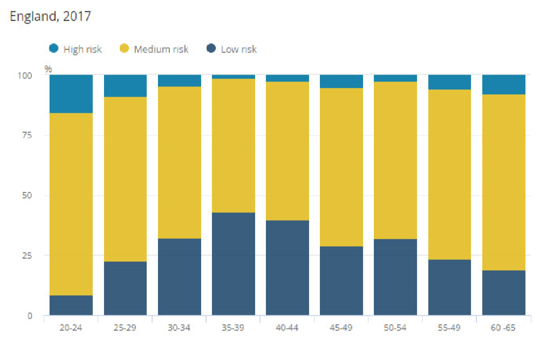 (英格兰不同年龄层工作者的工作被自动化取代的危险等级分布图)