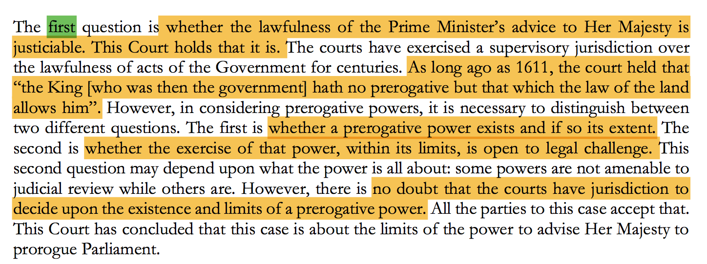 相比过往较为“技术性”的裁决意见,本次裁决意见显得平易近人。首先,最高法院认为“休闭议会”这一皇家特权属于法院裁决的范围。政府的律师代表认为,法院没有权力裁决“皇家特权”。对此,最高法院援引远至1611年的判例,明确了法院具有对“皇家特权”的司法权。