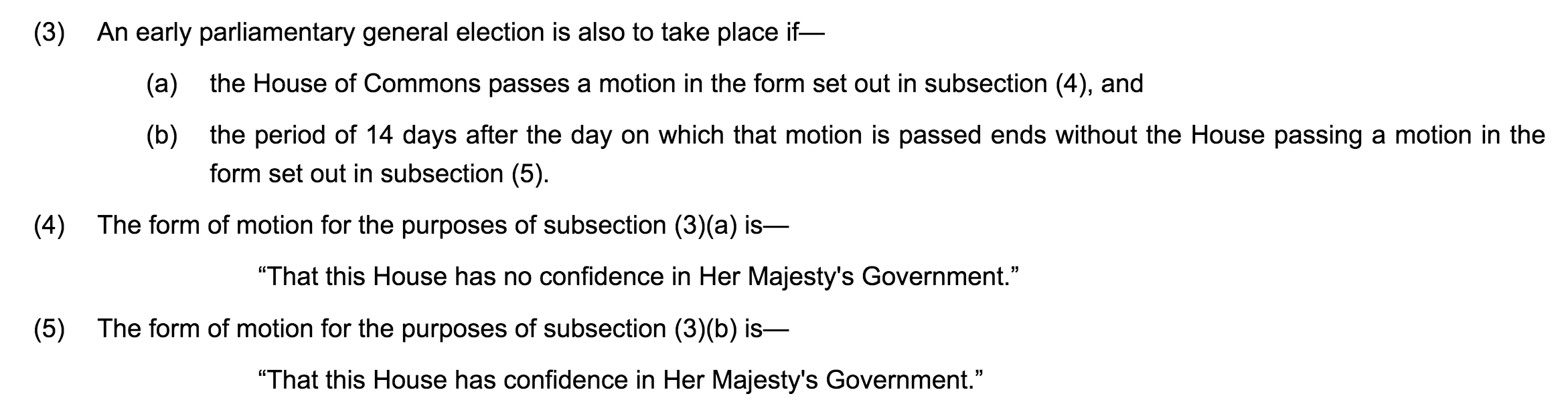第三,《定期议会法》规定,另一种提前进行大选的方式,是在议会下院提交并通过正式的“不信任案”动议后,如在14天的时间内没有一方能获得议会多数信任,便可进行大选。一方面,此条明确规定了“不信任案”的形式。在《定期议会法》生效前,“不信任案”一般表现为三种形式:其一,反对党或后座议员正式提出对政府的不信任案,与现在《定期议会法》一致。例如在1979年工党詹姆斯·卡拉汉政府被议会通过不信任案,并在大选中输给对手玛格丽特·撒切尔。其二,反对党投票反对财政预算案,或反对设定政府立法事项的“女王演讲”,以此表达对政府的不信任。例如,1924年英国大选便由斯坦利·鲍德温领导的保守党,投票反对工党政府的“女王演讲”而引发。