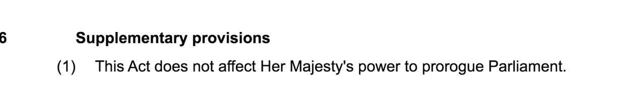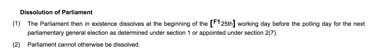 首先,当前议会必须在投票日前25个工作日解散。以上条款固定了议会解散与大选之间的时常,使得首相丧失了制定大选日期的权力。此前,在任首相自行制定大选日期,可以延长其选战时长,例如1997年英国大选,时任首相约翰·梅杰在3月17日解散议会,却直到5月1日才进行投票。在当前政局下,这条法律在使得鲍里斯·约翰逊不可能在10月31日脱欧日之前进行议会大选。在休闭前,议会并未通过政府大选的要求,而议会休闭结束后进行大选,大选日也已经远超10月31日。约翰逊在10月31日实现脱欧可选择的手段,进一步减少。