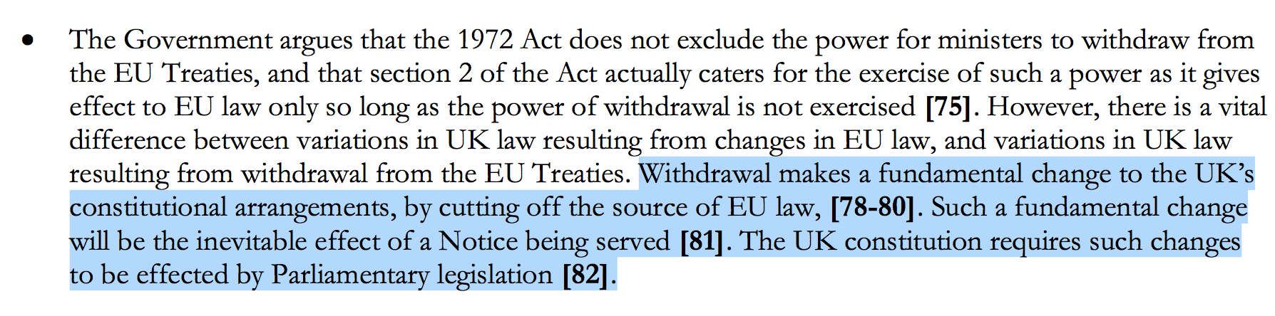 根据最高法院的裁决,脱欧将给英国的宪政安排带来根本性的改变——欧盟法律不再是英国法律的来源——如此变化必须通过议会立法的方式来进行。最高法院的裁决,还强调了直接民主的结果同样需要议会立法批准。