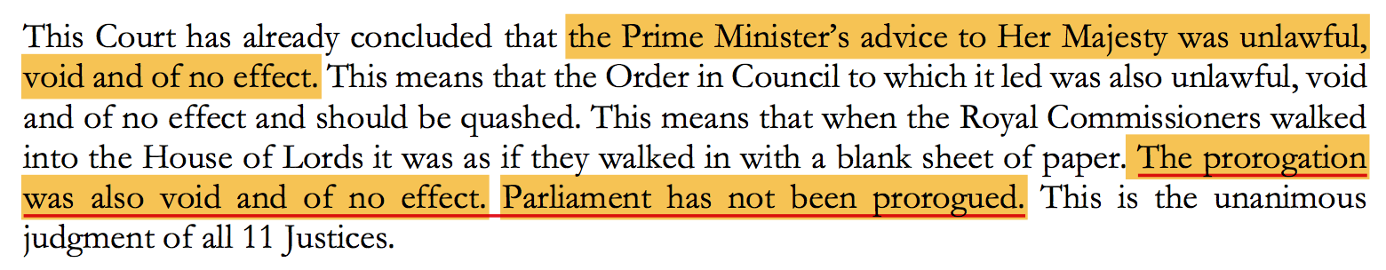 最终,最高法院判决约翰逊政府的做法“不合法(unlawful)”。需要留意“不合法(unlawful)”与“违法(illegal)”的不同。“不合法(unlawful)”主要强调行为不被法律认可,而“违法(illegal)”指行为违反了法律的明确规定。而法院仅裁决休闭议会“无效”,而不是行为“违法”。
