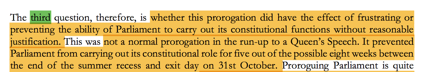 随后,最高法院认为鲍里斯·约翰逊休闭议会的时长,和休闭议会的时间,阻止了“议会问责政府”的“宪政功能”。