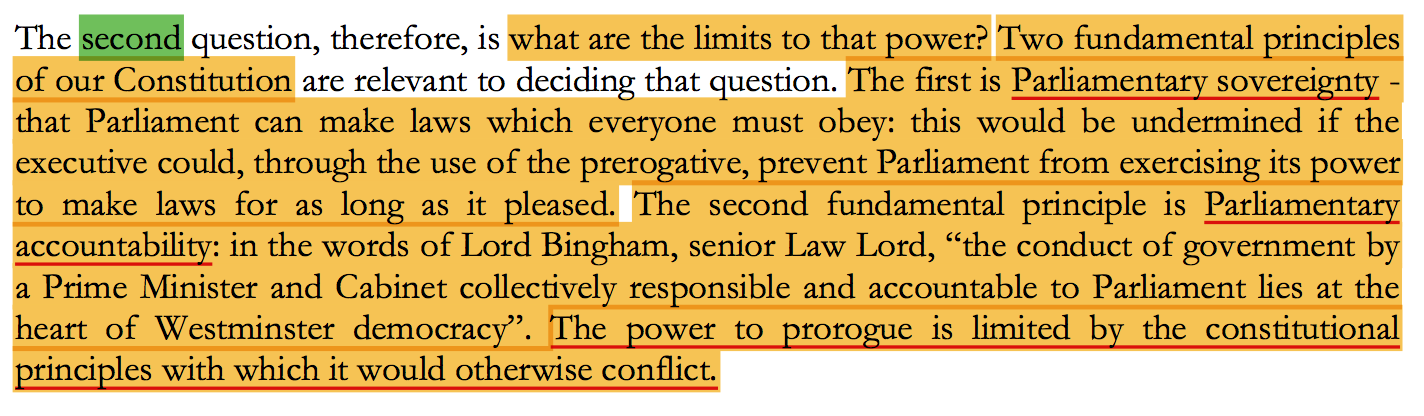 其次,最高法院认为,“皇家特权”存在边界,并且边界由“议会主权”和“议会问责”的原则决定。皇家特权不能与上述两原则冲突,否则不合英国宪法原则。