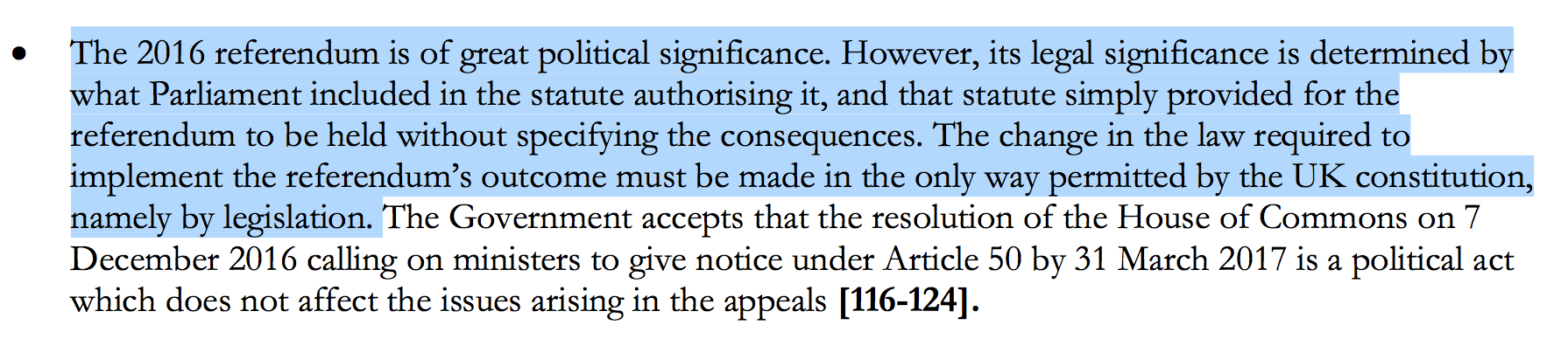 2016年,新上任的特蕾莎·梅政府尝试触发欧盟条约50条,开启脱欧进程。然而,女商人吉娜·米勒(Gina Miller)因此举将政府诉至英格兰威尔士最高法院,并最终申诉至英国最高法院。双方争议焦点,围绕“政府能否直接开启脱欧进程”这一问题。2017年初,最高法院法官以8票同意3票反对做出裁决,判决政府败诉:即政府不能在未经议会授权的情况下,直接联系欧盟触发欧盟条约50条,开启脱欧进程。