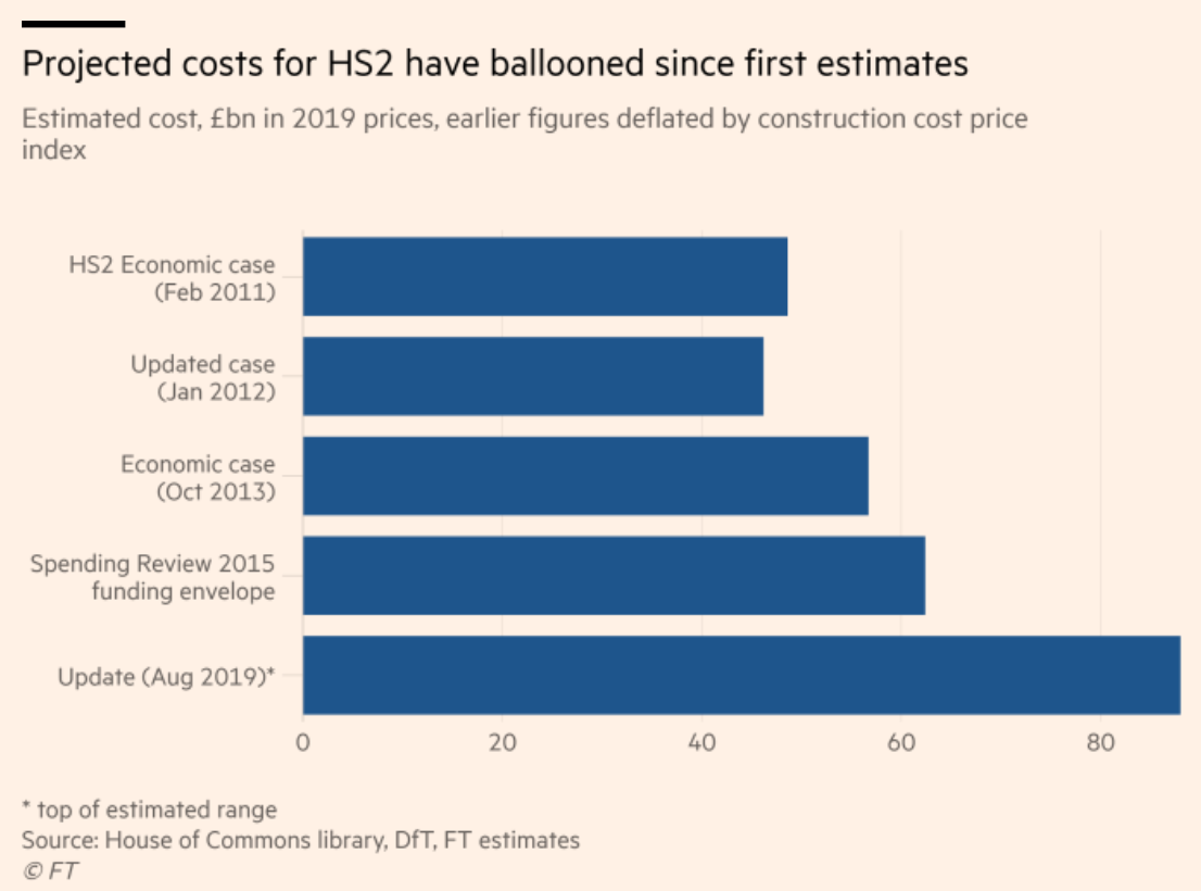 然而,在HS2反对者看来,这一切都不如一个问题重要:成本(以及受成本制约的回报率问题)。最早HS2规划的成本在350亿英镑左右,这个数字在15年涨到了560亿英镑左右,而今年,HS2主席阿兰·库克(Allan Cook)则表示,最终数字会在810亿英镑到880亿英镑之间。在这个问题上,HS2项目也被指责忽视一些专家对于成本大幅上涨的预警,而一再用较低的数字蒙骗民众。在2015年,HS2就已经因为其高昂成本登上了全国乃至世界大大小小的媒体,被称为“最贵高铁”。不断上涨的成本,使该项目的成本下回报率降低不少。根据亚当斯密中心最近对HS2的一项研究,得出其效益/成本比率低达0.78,基本意味着政府一定会亏钱。另一方面,它宣称的“快”(即达400千米/小时)也不合最终实际情况。因此,HS2的反对者们通常会猛烈指责HS2的所有美好愿景都是在“画饼”,而这块饼极有可能画不好还浪费纳税人的心血。反对者评论称,倘若道格拉斯·奥科维的报告真的支持政府继续项目,就是背叛公众。