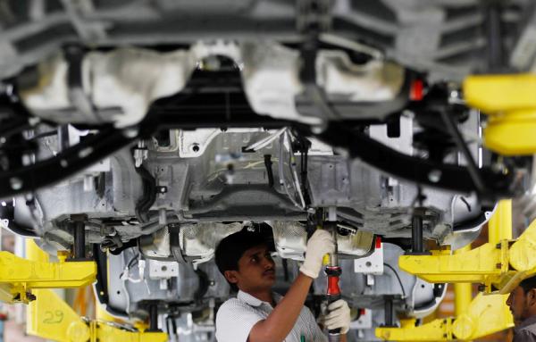 2013年2月26日,位于印度浦那的马恒达汽车制造厂内,一位工人正在装配汽车。 东方IC资料图
