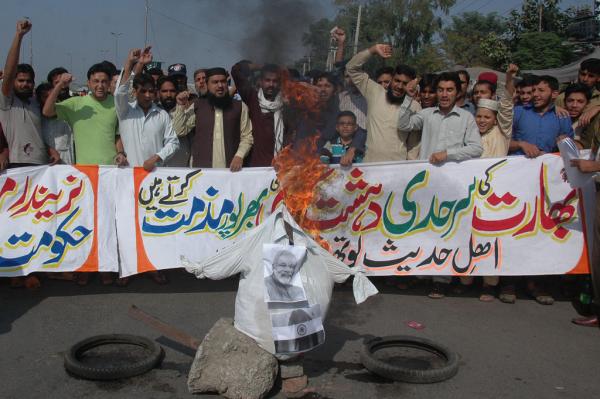 当地时间2014年10月17日,巴基斯坦拉合尔市,当地爆发反印度游行,示威者焚烧印度总理莫迪的相片和塑像。CFP资料