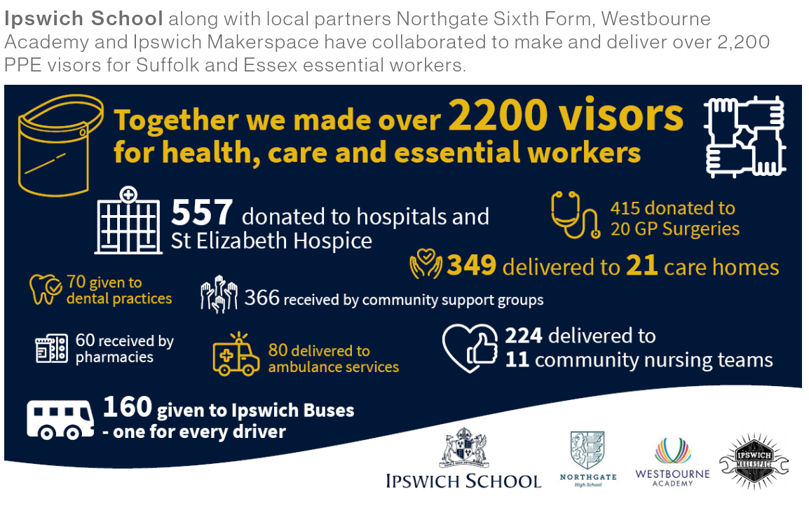 私立学校Ipswich School与其他机构合作为医疗人员制作提供了超过2200件防护面罩