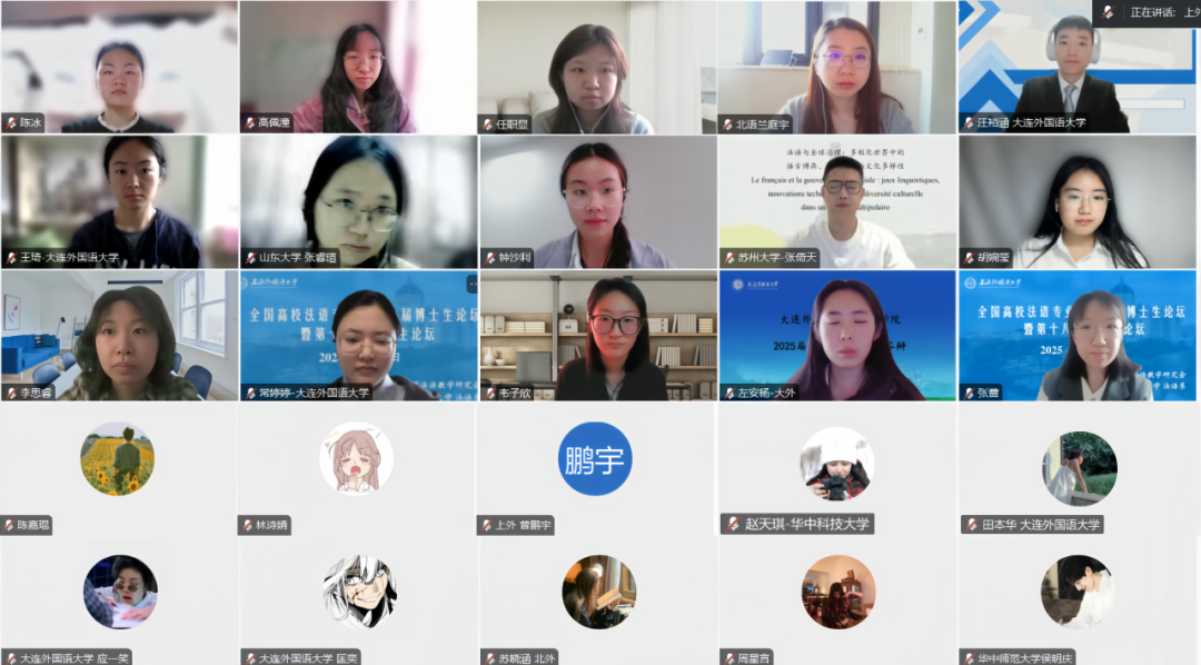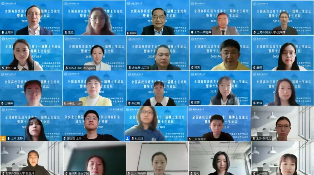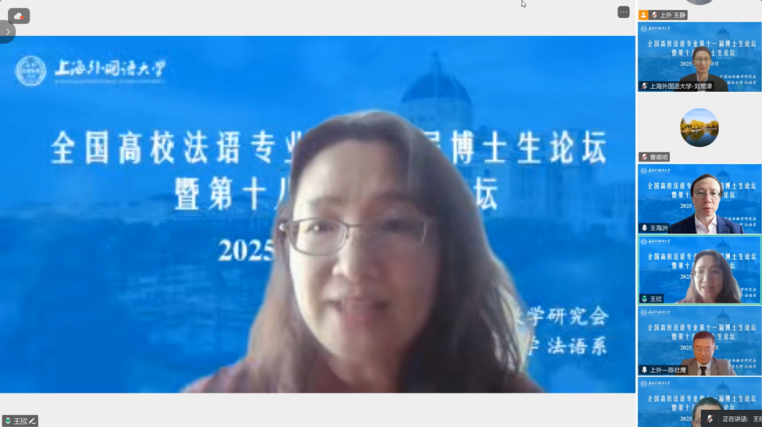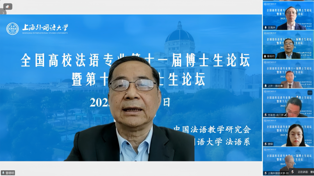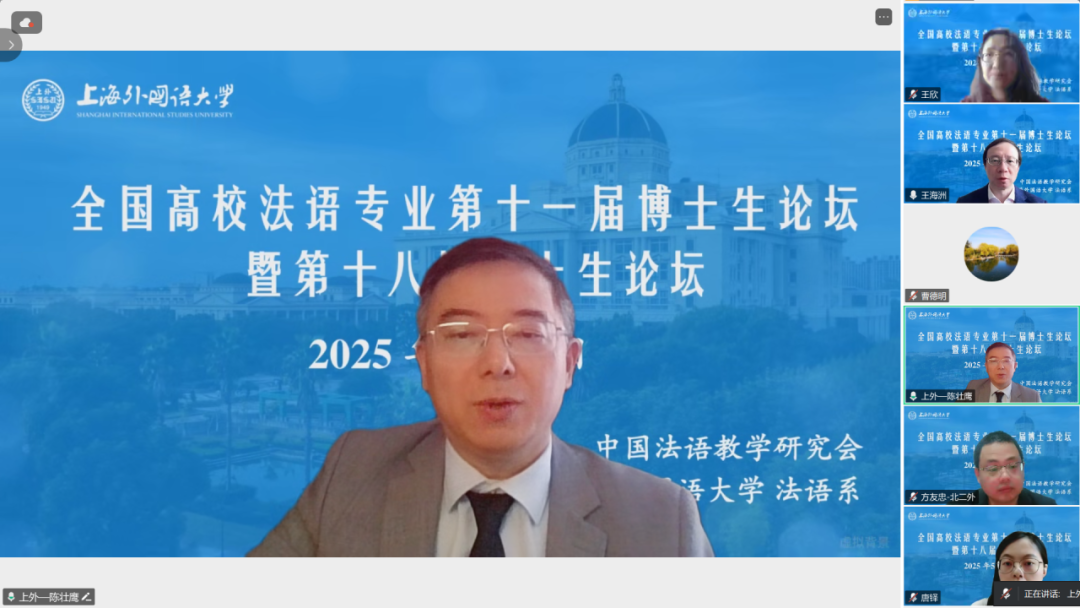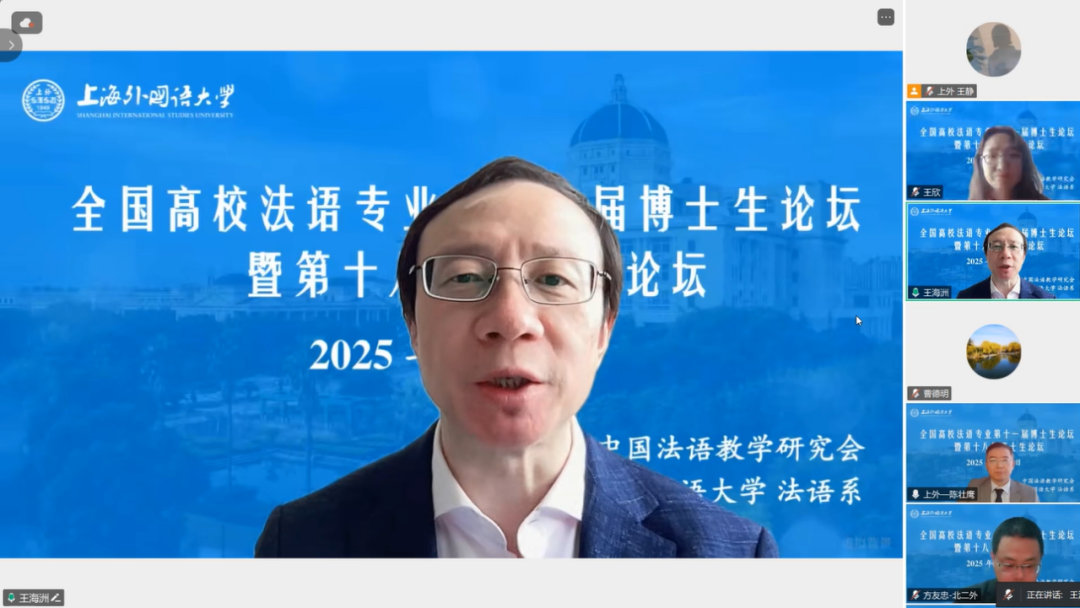 2025510日,由中国法语教学研究会和上海外国语大学法语系联合承办的全国高校法语专业第十一届博士生论坛暨第十八届硕士生论坛以云端会议形式圆满举行。上外法语系主任王海洲主持开幕式,上海外国语大学副校长王欣、中国法语教学研究会会长曹德明和上外研究生院院长陈壮鹰等领导出席并致辞。
