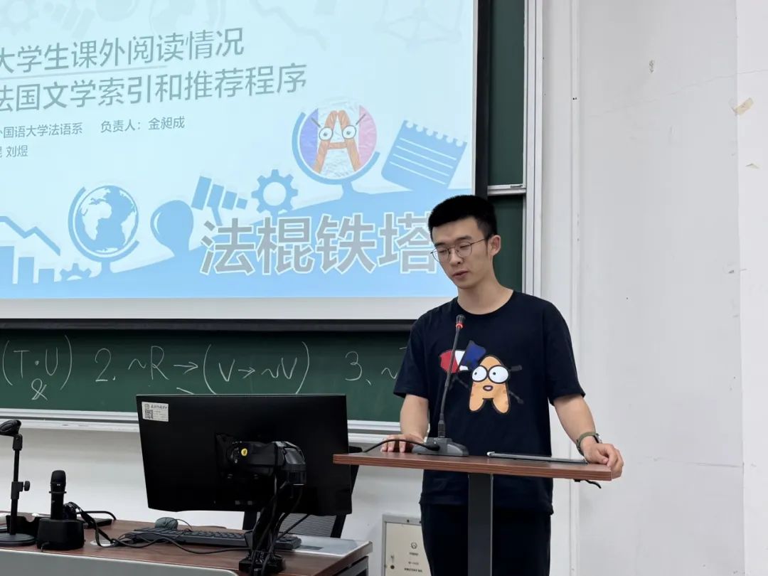 法语系项目以“基于大学生课外阅读情况构建法国文学索引和推荐程序”为主题,金昶成学长主要从项目介绍、项目成果与心得及实践经验三方面着手,分享了以微信公众号为项目“外墙”、微信小程序与网页端为“支柱”、数据库为“地基”、线上与线下活动为“装饰”的具体项目规划。
