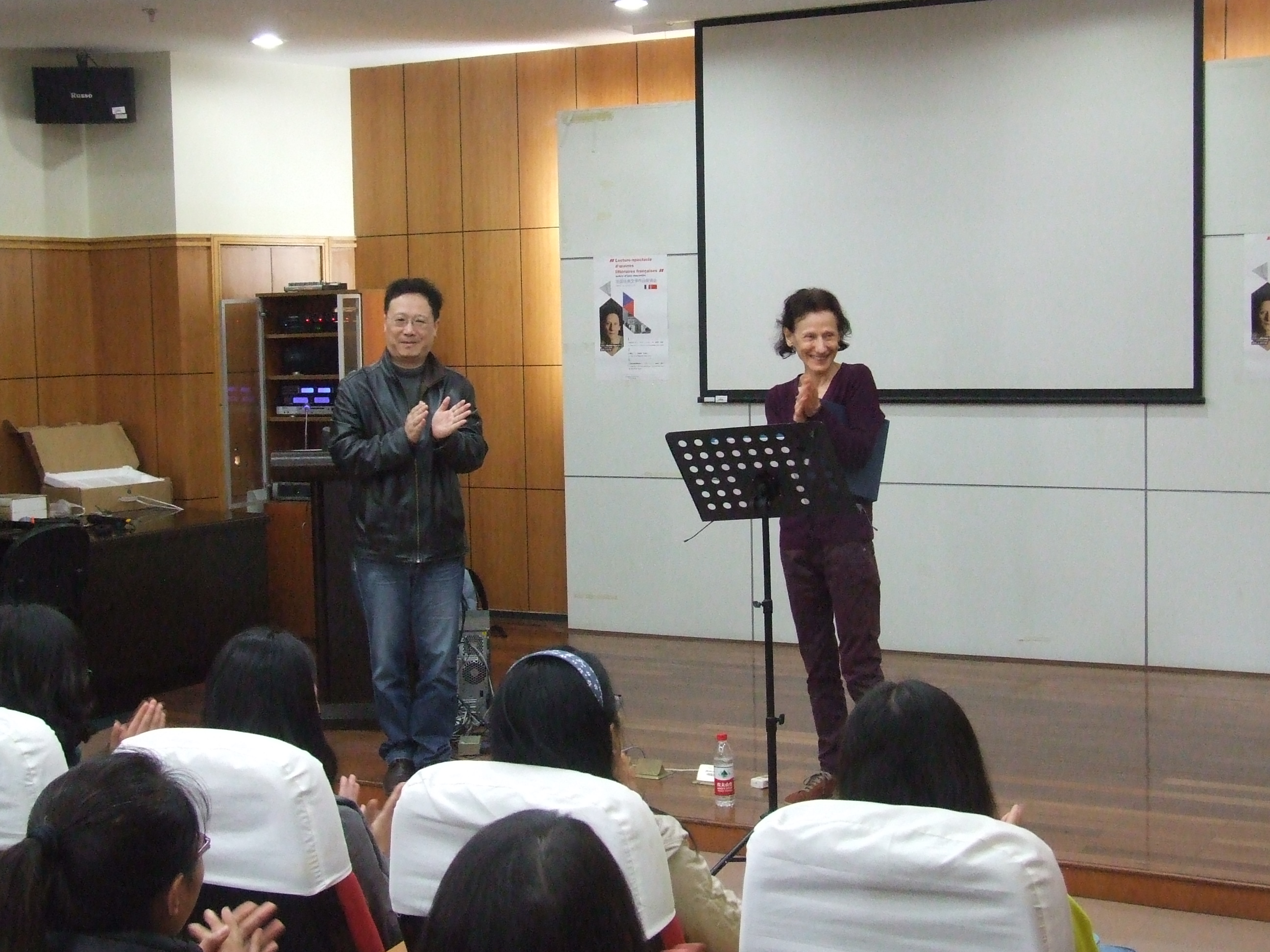 Michèle Sigal女士朗诵的内容主要是3位风格鲜明的作家作品:维克多·雨果作品《九三年》的节选“圣巴托罗缪的屠杀”,玛格丽特·杜拉斯《夏雨》节选和法国当代作家皮埃尔·米松的《文字之父》。三段作品讲述的都是人与书相遇的故事。Sigal女士的朗诵优美流畅,感情丰富,充分表现出法语中如歌唱般的韵律和节奏,让同学们在欣赏文学作品的同时也充分体会到了法语蕴含的语言魅力。