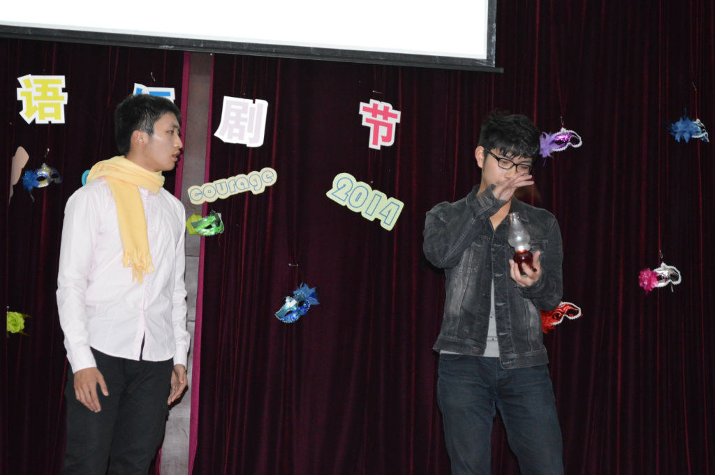 作为去年刚加入法语系大家庭的2013级新生,我们对短剧节抱着极高的热情。第一个上场的大一三班以一部改编的《杜十娘》一下将观众拉回到了古代,重现了李甲与杜十娘之间的爱怨纠缠,而戴舒安同学大胆出演老鸨这一角色,夸张的动作不仅赢得了观众们的阵阵掌声,而且将短剧节推向了第一个小高潮。