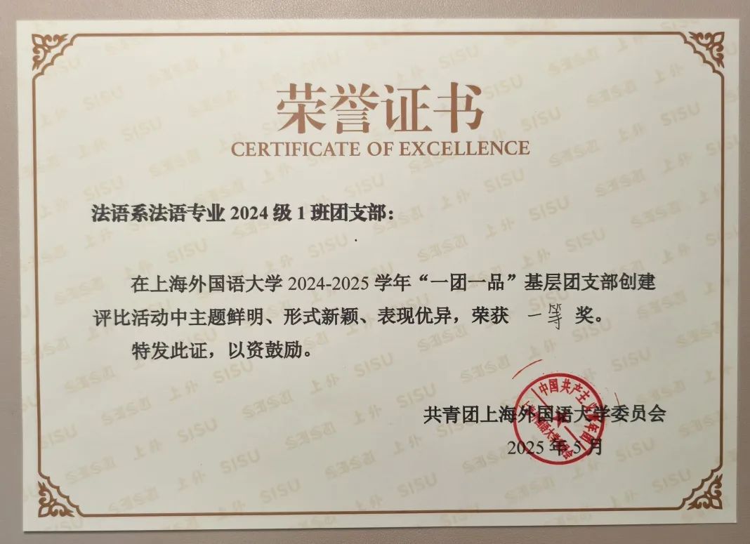 法语系法语专业2024级1班团支部荣获上海外国语大学2024-2025学年“一团一品”基层团支部创建评比活动一等奖。