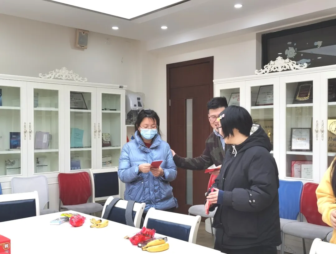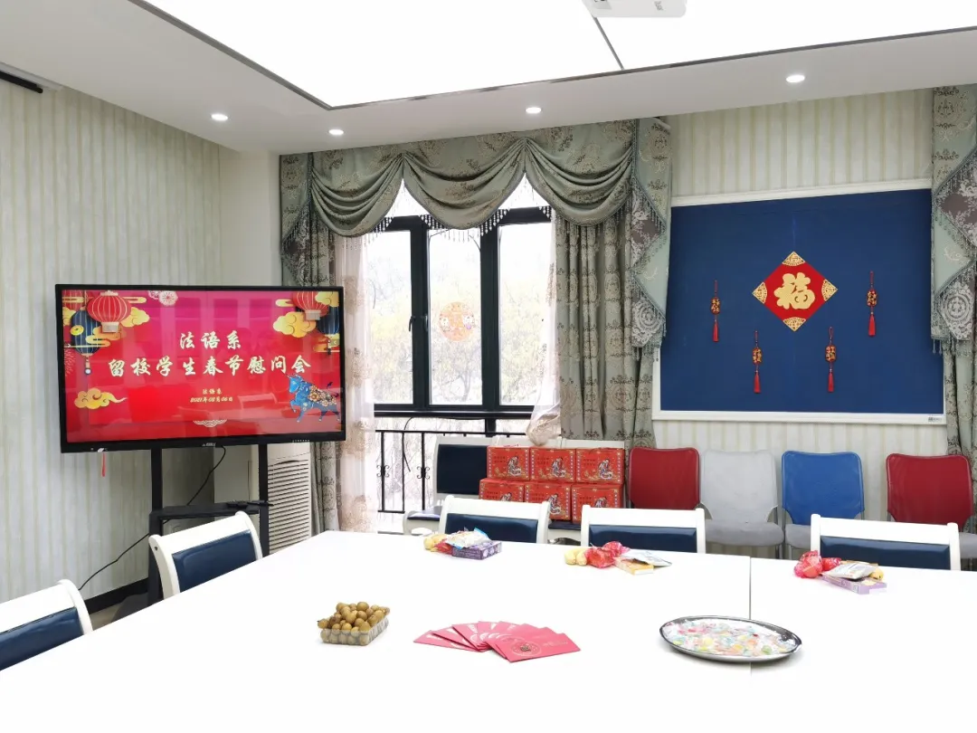 当天,会议室里喜气洋洋,年味十足。总支书记忻炯俊老师代表法语系向留校学生致以新春祝福,他亲切询问了同学们在校学习、生活和实习的情况,与同学们开展了真诚愉快的交流。忻书记表示,今年部分同学因为家乡疫情选择留校过年,学校为留校同学提供了充足的后勤保障并组织了丰富多彩的活动,希望同学们在校安心过年,同时也要注意劳逸结合、合理安排时间,过一个充实而有收获的假期。