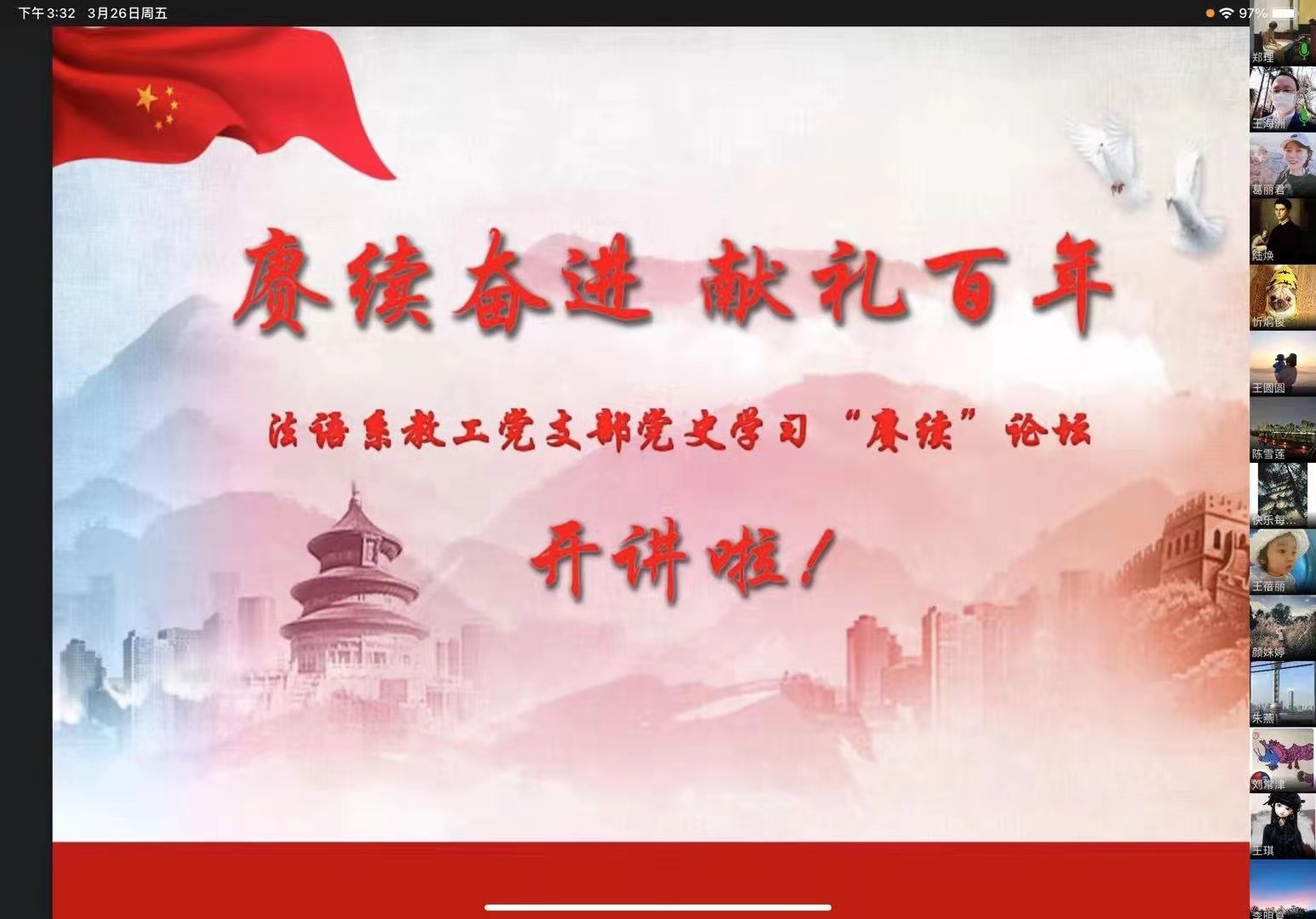 为了进一步贯彻党中央精神和教育部、校党委工作部署、推动党史学习教育活动有序开展,326日法语系党总支以视频会议形式召开党史学习教育动员部署大会暨“赓续奋进,献礼百年”系列活动之“赓续论坛”教工党课“开讲啦”第一讲。