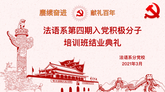 2021年3月26日,法语系分党校第四期入党积极分子培训班结业典礼暨实践分享会于会议室242举行。法语系党总支副书记陈雪莲及法语系专职组织员张艳出席本次典礼。结业典礼由法语系辅导员颜姝婷主持。