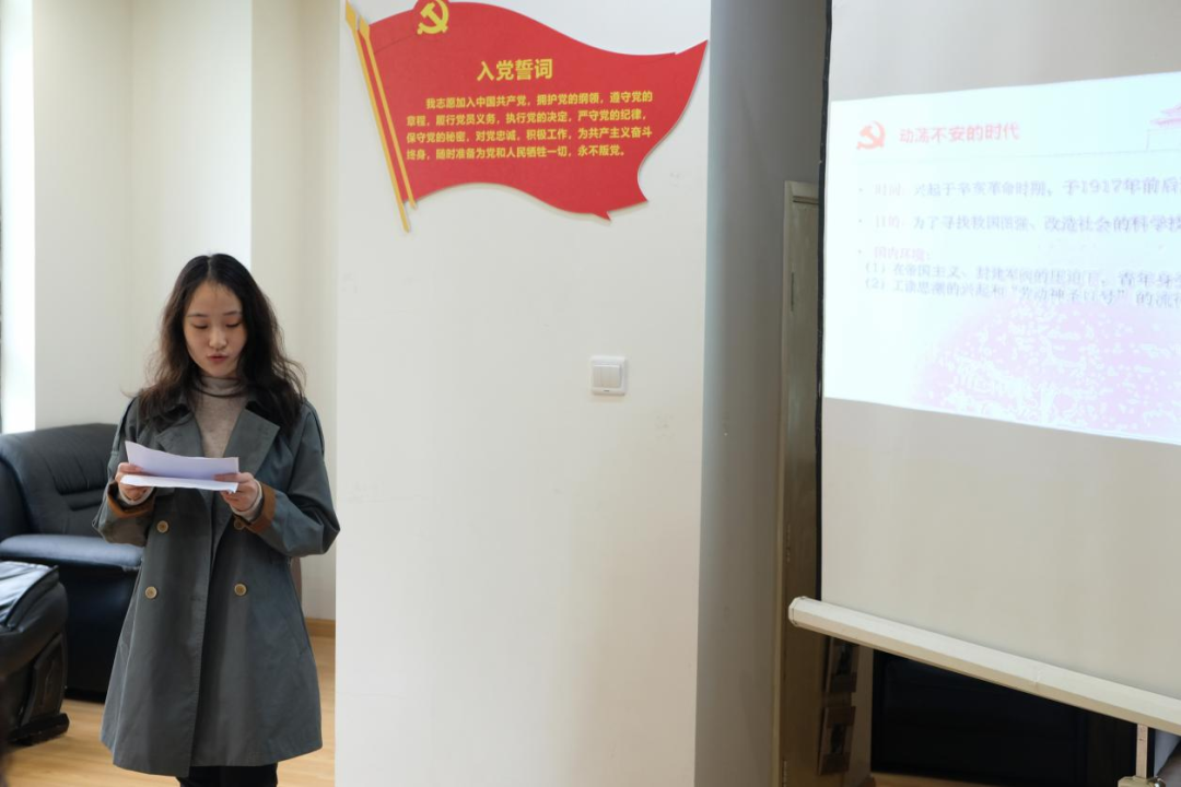 辛亥革命后期,留法勤工俭学运动及中国共产党留法支部在马克思主义理论的传播和党的发展历程中起到了不可忽视的作用。2018级学生党员王蕴宜围绕这一主题展开学习分享。她先通过一个小互动带领大家回望当年的时代背景,接下来通过讲述留法勤工俭学运动中的点点滴滴,刻画出一位位自强不息的先进青年的形象。在分享过程中,她提到自己在查阅资料时被蔡和森先生的事迹深深打动:“如今我们出国有国家和家庭的支持,但是我们的前辈们是抱着一颗想要救国救民的热忱的心到法国去勤工俭学的,他们一切衣食住行都是通过劳动换得的”。