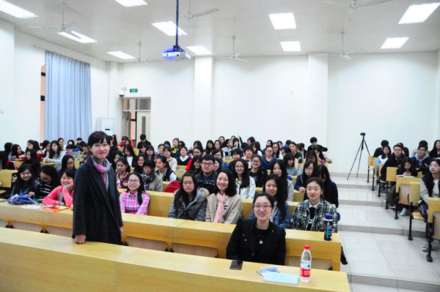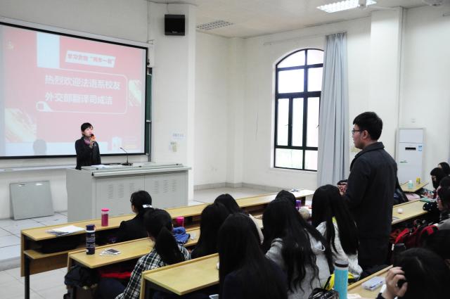 2016年4月26日上午,在3359教室,我系杰出校友、现任职于外交部翻译司的成洁学姐为我系一、二年级同学开展讲座。学姐细致而生动地讲述了她在法留学的体验、初入外交部的经历以及在外交部的工作生活情况。在座各位同学在欢笑中由衷地赞叹,在赞叹中默默地思考自己未来的方向。