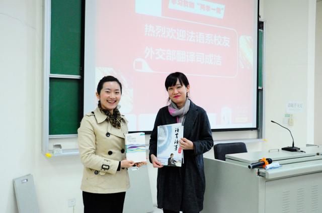 最后,辅导员向成洁学姐赠送了由曹德明校长编写的《法语与法国文化研究》,学姐向我系回赠了外交部的期刊《译言译事》(此刊物将存放在法语资料室供全系师生借阅),就此,讲座圆满地落下帷幕。