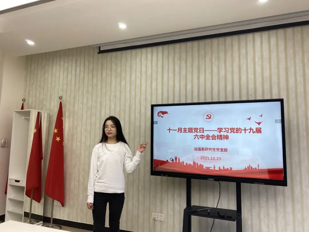 11月23日上午,法语系研究生党支部在三教楼会议室242举行了“奋斗百年路启航新征程——学习党的十九届六中全会精神”主题党日活动,活动由研究生党支部书记马静主持。