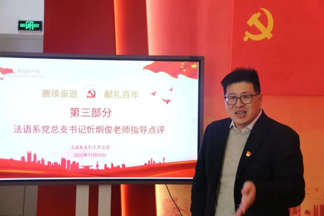 最后,法语系党总支书记忻炯俊老师对两位同学的分享进行点评。忻老师充分肯定了陈思多和刘宇轩的分享,指出两位同学从不同角度精彩地展示了进博会志愿者的工作体验和所思所想,充分体现了学生党员不忘初心、牢记使命,以实际行动践行十九届六中全会精神的行动自觉。忻老师指出,今年是建党一百周年,举办第四届进博会充分体现了我们国家面对新冠疫情影响和世界局势的复杂变化,更加坚定深化对外开放、全面推进社会主义现代化强国建设和实现中华民族伟大复兴的信心和决心。最后,忻老师对所有党员同学提出希望:国家富强、民族复兴与每位同学的成材成长休戚相关,认真学习贯彻十九届六中全会精神,把个人成长和发展融入学校、社会和国家发展的历史洪流之中,是每名党员责无旁贷的使命担当。